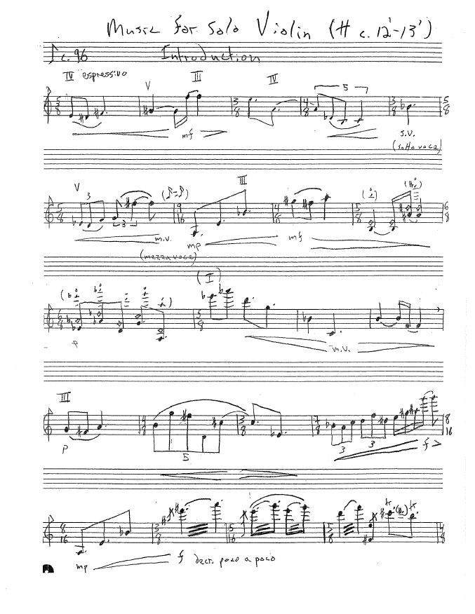 Here is a piece of music where I felt I was creating a “thing,” rather than a piece of music (whatever that is). Surer steps away from dramaturgy and towards a more fully present and immediate kind of sonic engagement. The main portion of the composition was written first, and, in a sense, constructed from component parts (parts harmonic, parts pizzicato, parts double-stop tremolo, etc.). The “Introduction”—expansive, even expressive—was written last, as a kind of afterthought as preamble foil.