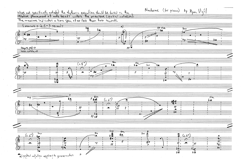 My first composition to employ a spatial approach to rhythmic notation—a technique that would return in a four-hand piano piece (2004), an organ piece (2006), a short guitar piece from (2007), and finally blast through to become a major tool in my compositional arsenal with the untitled composition for 3 flutes, violin, piano, percussion, and string quartet (2007)—this piece celebrates the act of drawing sustained sounds out of the piano. The title reflects the fact that it was mostly composed at night, and might be most successfully performed at night as well. Almost entirely soft throughout, in a tragic misstep—which I would never make today—a single loud chord crashes through approximately two-thirds of the way through. (At this point, a sympathetic performance would ignore that particular dynamic indication—or, better, simply not play the chord at all.) The soft, broad, semi-repetitive ending, embracing a small number of discrete gestures—a single note, a dyad, a “paw print”—hinted at, for me, an unexpected kind of musical freedom.