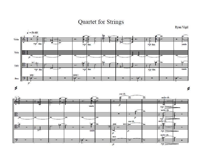 “Quartet for Strings,” rather than “String Quartet” due to the inclusion of a bass instead of the second violin. Those low notes, and the mellower timbre of the bass, were needed here. A prime example of the kind of “abstract” composition that was a particular interest of mine at the time (and has remained an interest, to be explored in various ways). Here can be discerned a touch of formalism, even geometricism: the sense that the various musical elements inhabiting this piece are “things,” somehow—and they can be positioned in such a way as to shed light on each other and the whole.