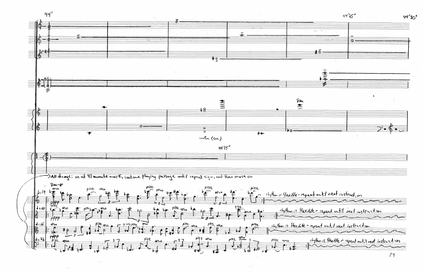 Like the untitled piano piece from 2004, this piece represents an interesting point of arrival or opening up. Specifically, I found myself here exploring a much longer duration than ever before (and doing so with a spatial approach to rhythmic notation). Nearly all of my previous pieces were between 5 and 25 minutes—and most between 10 and 20. Here was an opportunity to paint on a larger canvas. I found this to be quite freeing. Space between sounds had become an increasingly frequent component in my work. Now that sense of space took on a new dimension. I found increased liberation from concepts of narrative and structure in crafting musical experiences that called for a new approach to scale (in Feldman’s sense) and composition (in the painterly sense). A good way to think about this piece is as a duet for violin and piano with other things happening as well.