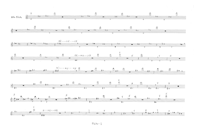 Subsequent to the completion of my work for flute, violin, piano, percussion, and string quartet from 2007, I experienced a kind of liberation. As if stepping through a doorway into a new and much larger space, I had a fresh sense of what was possible in terms of the direct experience of sound when that experience is calibrated over an extended span of time. This work for alto flute and percussion resonates in that space. The kinds of subtle gradations explored in previous compositions are now placed under the microscope—of deep significance, for example, is the difference between a vibrato and a non-vibrato sound, a whole note and a dotted whole note. At various points, the percussionist explores a single sound for anywhere from 45 to 90 seconds—a notion that reaches a kind of apogee in the four-minute stretch of my solo violin piece from 2018 where the violinist softly rings an assortment of tiny bells hung from a string.