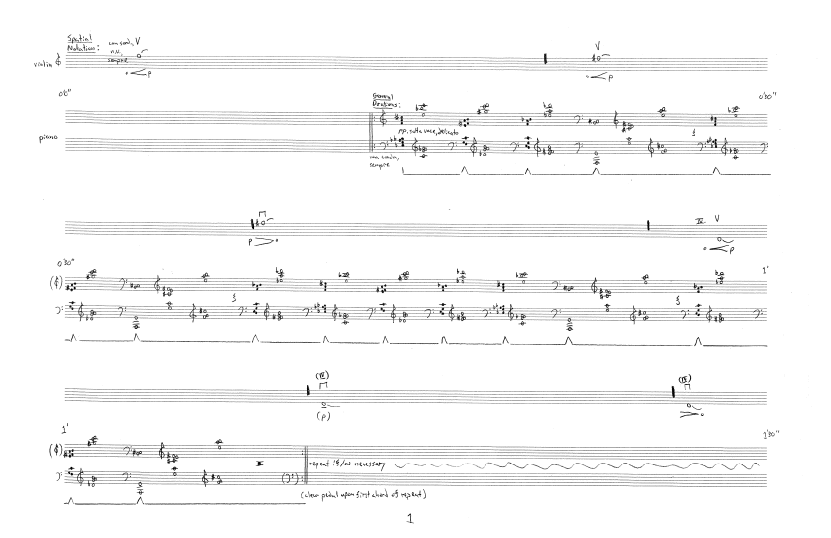 Composed for my dear friends and close musical conspirators David Hyun-Su Kim and Lauren Basney, this piece distills many of the ideas I had been working with in the preceding years. Although the parts are mostly rhythmically independent, they are nonetheless entirely interconnected. In the first part, the piano sound serves as a kind of “bed,” gently receiving and supporting the violin sound. Later, the roles are somewhat reversed—even as the violin plays the more active role, it is mostly just a foil for the accumulating piano arpeggio (quite the star of the show). The piece concludes with the introduction of something new (muted piano) and the simplest application of the repetitive ending strategy employed in various compositions starting with Nocturne (2001).